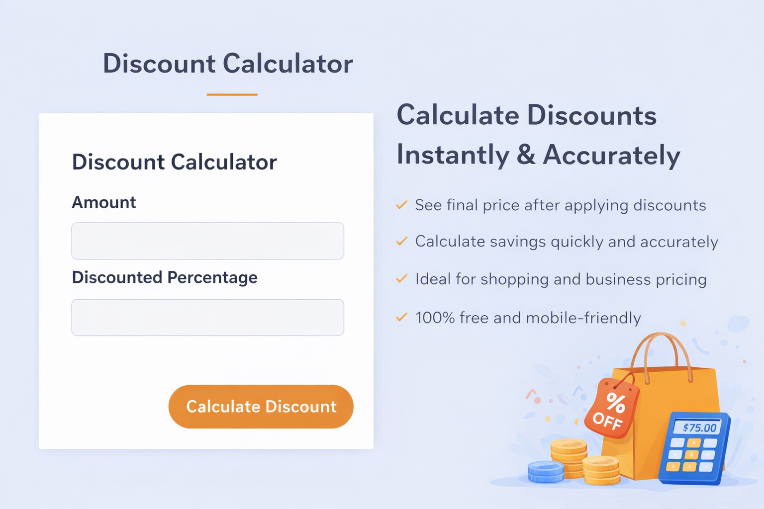 Instantly calculate discounted prices with this easy-to-use Discount Calculator. Perfect for shoppers and sellers.