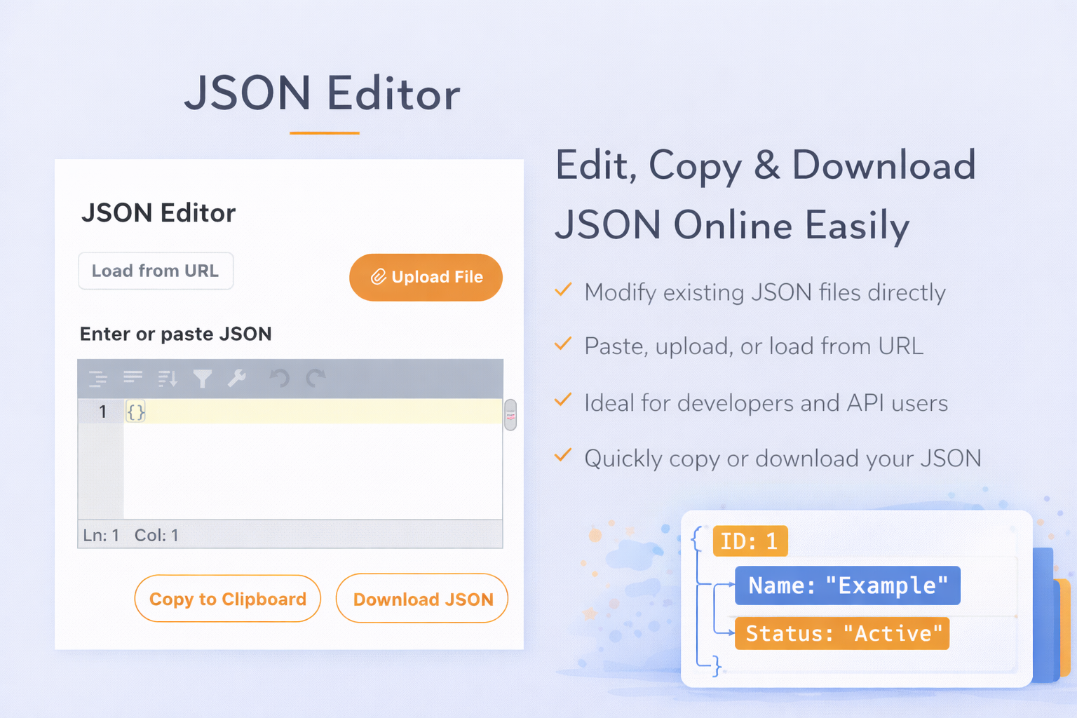 The JSON Editor is a powerful online utility designed to help users easily view, edit, and manage JSON (JavaScript Object Notation) data in a structured and readable format. This tool is especially useful for developers, API testers, data analysts, and students who work regularly with JSON files.