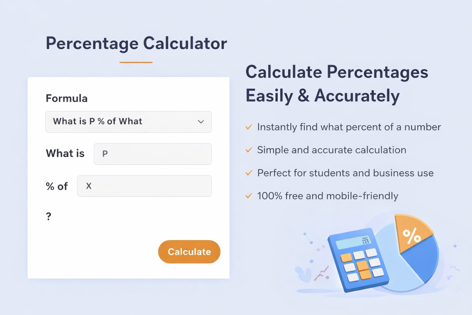 The Percentage Calculator is a simple and practical online tool designed to help users calculate percentages quickly and accurately. It is especially useful for students, teachers, business owners, accountants, and anyone who deals with numbers in daily life.