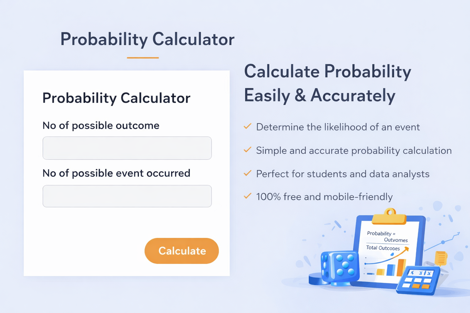 The Probability Calculator is a simple and efficient online tool designed to calculate the likelihood of an event occurring based on basic probability principles. It helps users quickly determine probability values without manual formulas or calculations.