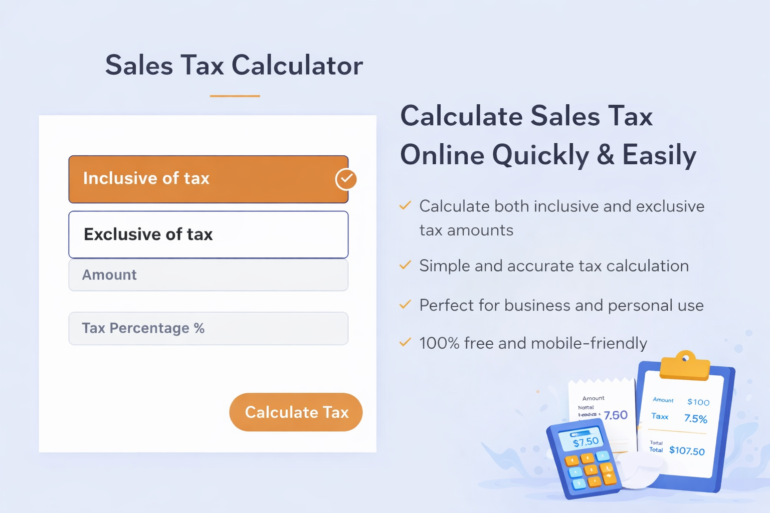 The Sales Tax Calculator is a simple and reliable online tool designed to calculate tax amounts accurately for any purchase or transaction. It helps users quickly determine tax values whether the entered price is inclusive of tax or exclusive of tax.